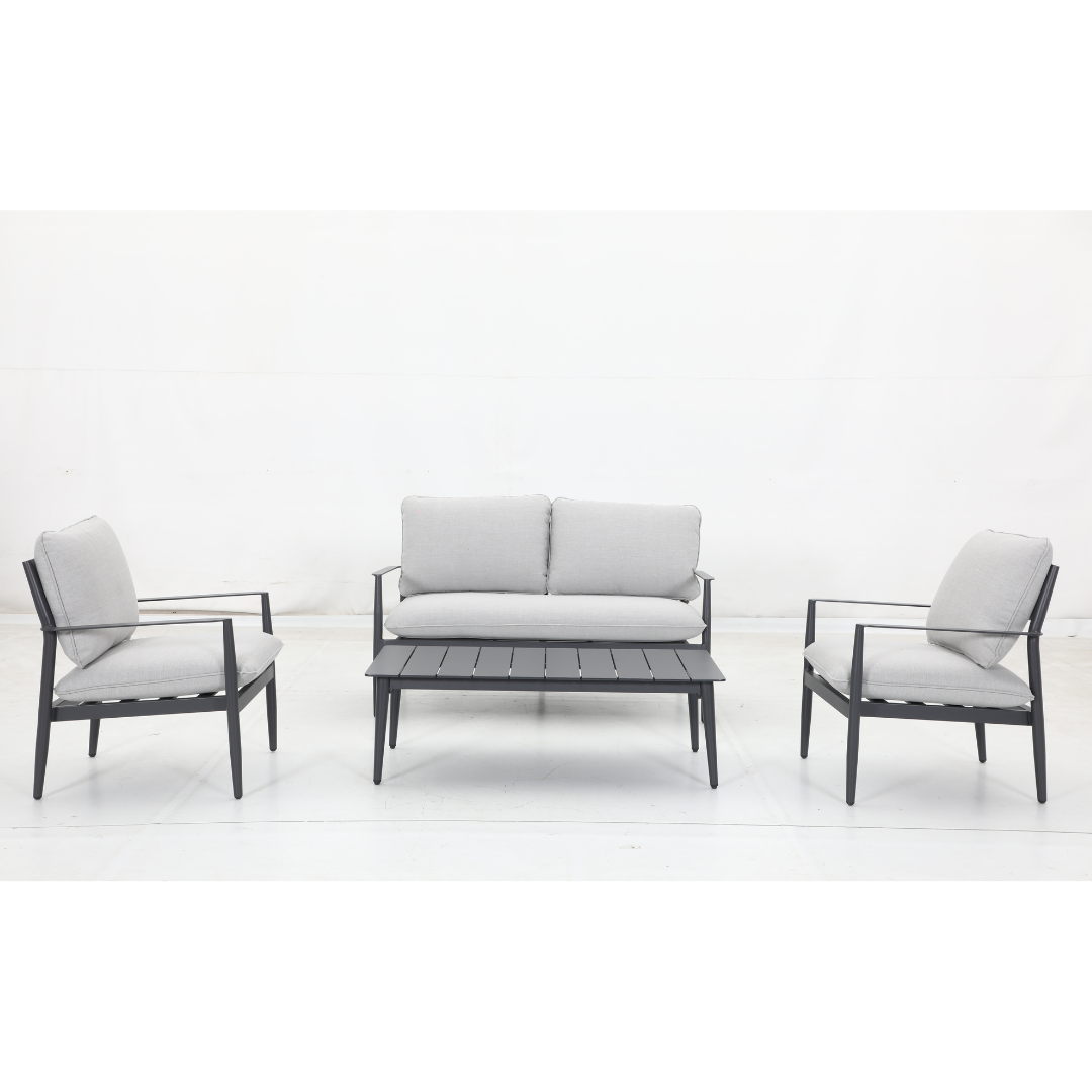 Outdoor Entertaining is easy with the French 4pce Lounge setting. Sleek Lines and crisp modern tones, creating a minimalist & modern vibe. Also available in a corner lounge setting.